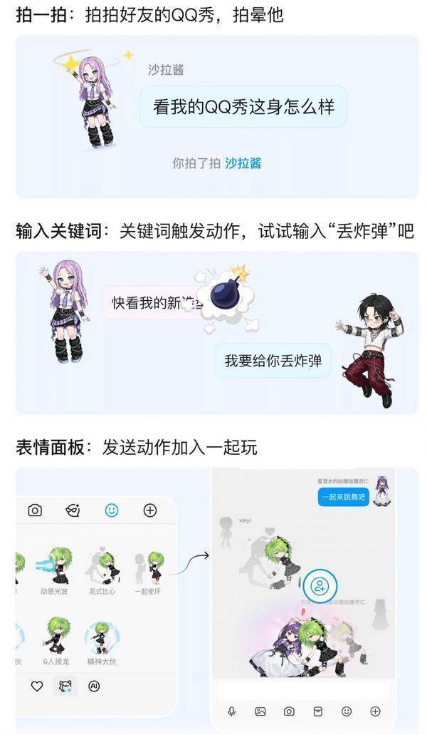 群聊“整活”新姿势,从“拍一拍”到“一起嗨”此外,在社交互动层面,QQ秀带来了更生动、更有参与感的玩法体验。过去,用户在聊天里拍一拍好友的头像,只能看到好友设置的趣味文案。现在,QQ秀小人代替头像进入了聊天场景里,拍一拍即可实现小人头晕目眩或原地起跳的效果,这种“破框而出”的生动反馈,让每一次轻互动都更鲜活;输入“哈哈哈”、“爱心”等特定关键词还会触发隐藏彩蛋,小人会根据关键词做出对应动作。当好友设置了QQ秀后,小人之间也可以进行互动,为日常对话增添不少意想不到的趣味。在群聊的场景中,这种互动也变成了一种集体“整活”的时刻。当一位群成员发送互动动作之后,其他好友点击“加入”,就可以召唤自己的QQ秀小人参与互动,形成一种可蔓延、低门槛的群聊社交新玩法,丰富了线上社交互动趣味性和参与感。